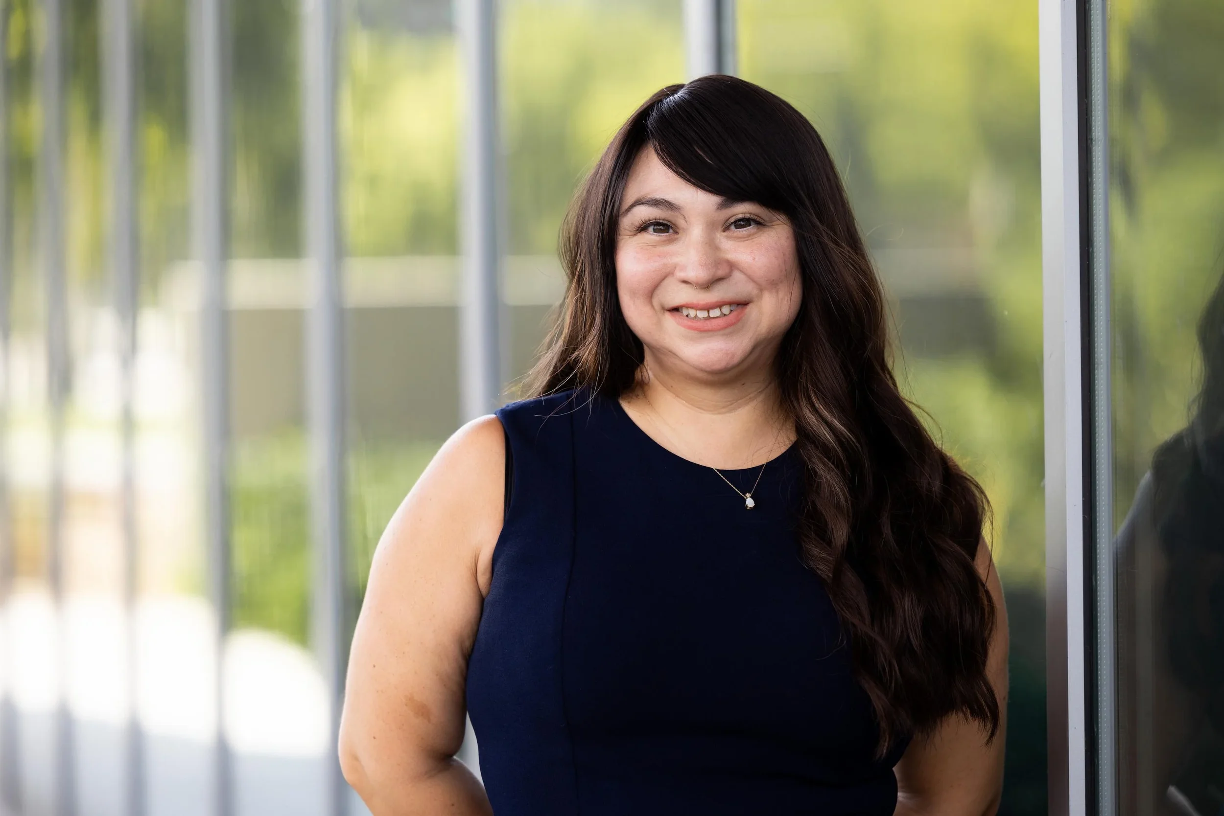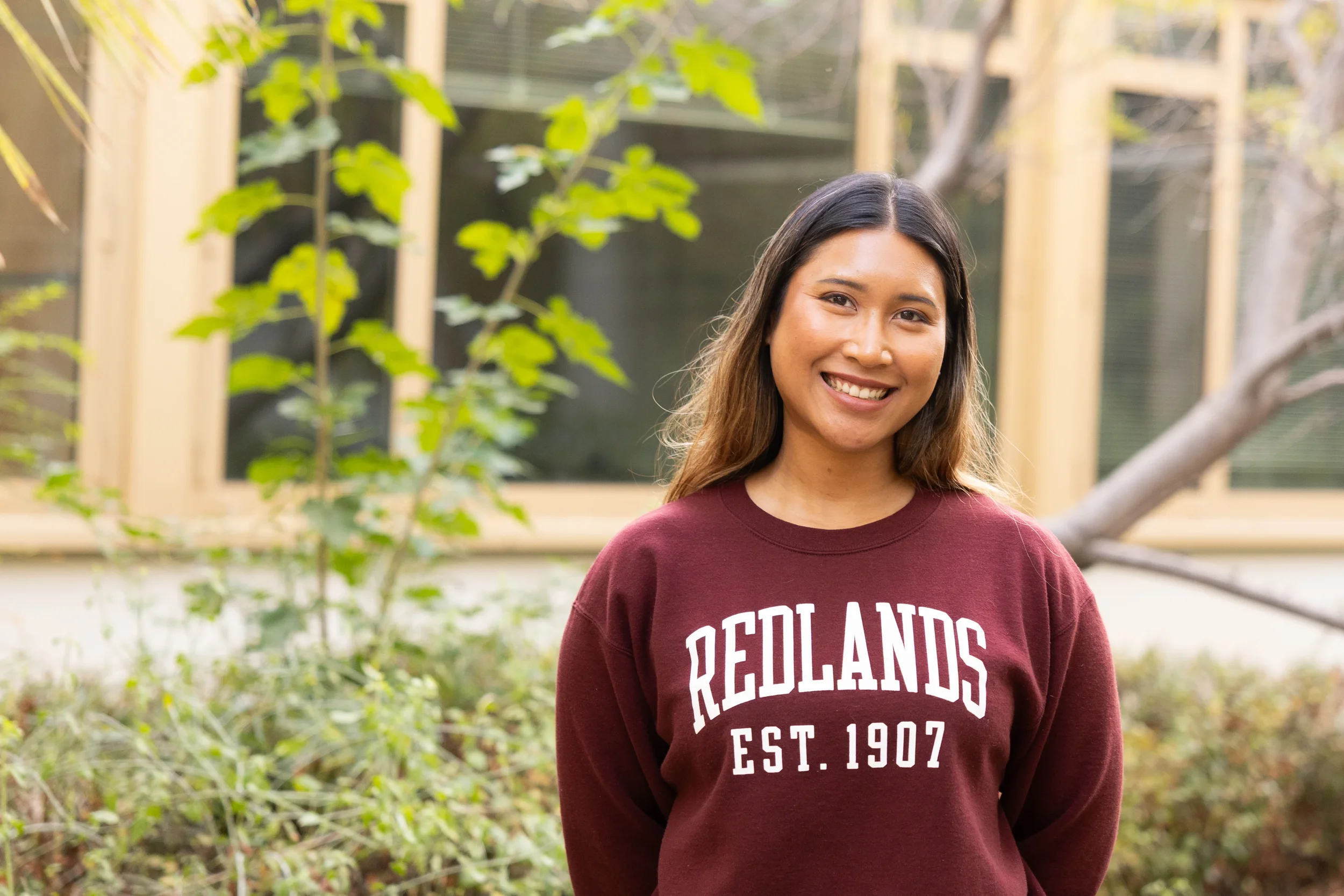 A young woman with a smile, crossing her arms, standing outdoors in front of a modern building with glass and wood accents.